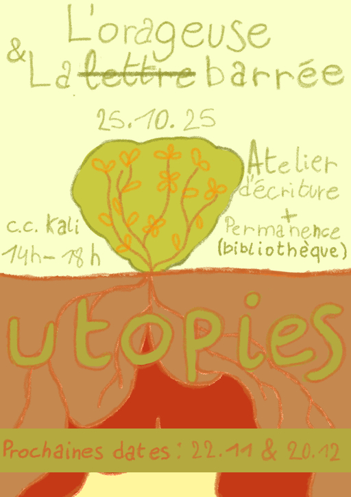 Samedi 25/10, l'Orageuse & La lettre barrée vous accueillent à la CC Kali de 14h à 18h pour un atelier d'écriture sur le thème des Utopies !