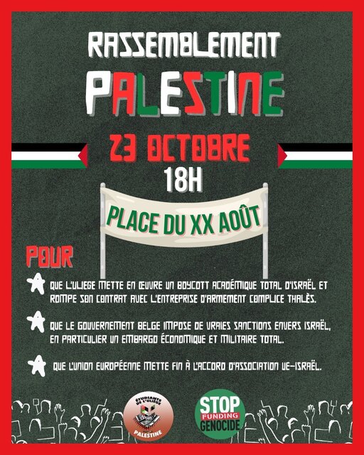 Sfg Liège et l'Ocupation étudiante pour la Palestine organisent un grand Rassemblement ce jeudi 23 octobre en face du bâtiment du xx août suite à la grève académique qui aura lieu le même jour