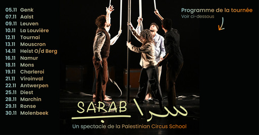 Cinq jeunes acrobates de la Palestinian Circus School évoquent la question des impossibles migrations, des libertés rabotées, des identités multiples. Acrobaties au sol, mât chinois, portés… leur engagement et leur énergie sont visibles et sincères, tant dans leur pratique artistique que dans le message qu'ils portent. Sarab est l'histoire d'un siège, d'une survie, et donne à voir ce qu'endurent des individus contraints de vivre et de subsister dans un environnement où insécurité et menaces nourrissent chaque jour un peu plus leurs craintes. Plus engagé que militant, Sarab devient ainsi le point de repère lumineux d'un collectif d'artistes de cirque qui nous propose de cheminer avec eux.