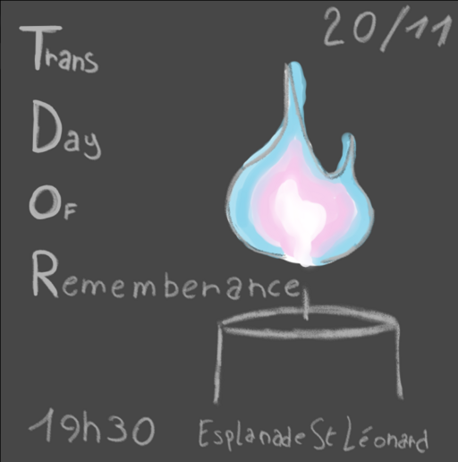 Ce 20 novembre, jour du souvenir trans, nous vous proposons de nous rejoindre sur l'esplanade St Léonard à 19h30 pour une prise de parole