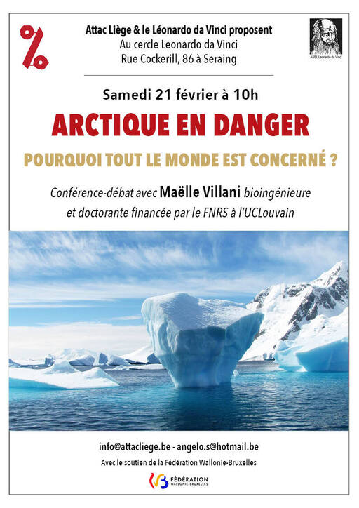 ATTAC-Liège et le Leonardo Da Vinci vous invitent à une conférence-débat « Arctique en danger - pourquoi tout le monde est concerné ? » avec Maëlle VILLANI, bioingénieure et doctorante financée par le FNRS à l'UCLouvain