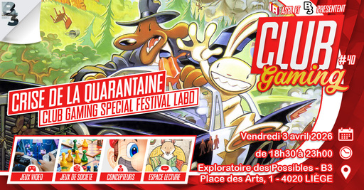 Nous vous fixons rendez-vous le vendredi 3 avril 2026 pour la quarantième édition du Club Gaming à partir de 18h30 à l'Exploratoire des Possibles du B3 (1er étage), Place des Arts, 1 - 4020 LIÈGE. Bienvenue à tous !